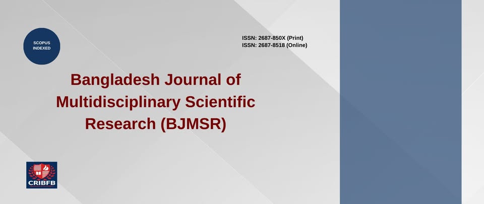 Journal Full Title: Bangladesh Journal of Multidisciplinary Scientific Research; Journal Abbreviation: Bangladesh j. multidiscip sci. res.; Journal ISSN (Print): 2687-850X; Journal ISSN (Online): 2687-8518; DOI Prefix: 10.46281/bjmsr; Journal Frequency: 6 Issues (Continuous Publication); Article Acceptance Percentage: Below 10%; Publication Ethical Guide: Committee on Publication Ethics (COPE)’s; Peer-Review Policy: Double-Blind (External) Copyright and Licensing: The Author(s); Creative Commons Attribution 4.0 - International License; Publication Policy: Open-Access Journal; Authors' Geographical Diversity: International; Editorial Members' Geographical Diversity: International; Publish Mode: Publish-as-you-go; Business Model: Golden Open Access; Editor: Professor Dr. Ahmed El-Masry, Covenry University, UK Citation Analysis: Scopus |Web of Science |Google Scholar